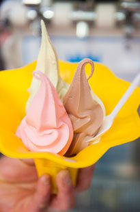 王道32cmソフトクリームもお忘れなく! やはり明洞に来たからには一度は買い食いしてみたい「32cmソフトクリーム」。なぜ32cmなのか?と、不思議に思っていたのですが、それは、ソフトクリームの絞り口から機械の底部分への長さが32cmなのだそう。絞り出せるギリギリ限界の長さが32cm!ということで、謎は解けましたね。ただ、長すぎて食べにくい!という方には、3つのフレーバーが楽しめる「ソフトアイスクリーム」がおすすめ。スプーンでゆっくり食べることができますよ。お値段は、ともに2,000ウォン。デザートには迷わず「32パルペ」へ、ぜひ足を運んでみてくださいね!