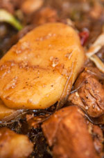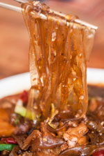名物「チムタク」を食べよう! 鶏肉と豊富な野菜を甘辛く煮込んだ「チムタク」はしいていうならば、すき焼きにもう少しパンチを効かせたような味が特徴的です。テーブルに運ばれてすぐの段階ではそんなに辛くないのですが、時間が経つにつれ、一緒に煮込まれた赤唐辛子から辛いエキスが出てしまうので、苦手な方は最初のうちによけておくことをおすすめします。また、大皿の下の部分に敷かれたタンメン(春雨)はのびてしまわないうちに食べるのがコツです!
