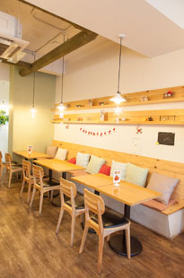 テーブルの間隔が広く設けられていることから、周囲に気をつかうことなくゆったりとくつろげるのが「cafe pongdang」の特徴。お店の規模は、西村の街でもトップクラスの広さを誇ります。