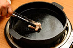 「ケビプルコギ」の美味しい食べ方 スタッフ直伝!美味しい「ケビプルコギ」の食べ方を紹介します。お皿に山盛りになって登場する野菜とお肉とタンミョン(韓国春雨)。これらを下記の手順でお鍋に並べていきます。野菜とタンミョンはおかわり自由!タンミョンの他にも冷麺の麺を追加注文(2,000ウォン)することもできます。ダシにくぐらせて食べると絶品!