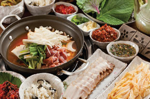 贅沢の極み! 韓国料理をまるごと楽しんで! 続いて「キムチゴル」の人気メニューのご紹介です。チョッパル(豚足)やポッサム(包み茹で豚)など、お酒のおつまみにも適した肉料理をはじめ、家族みんなで楽しめる鍋料理も豊富に揃っています。そのすべての料理に共通するのは、多彩なミッパンチャン(おかず)。包み野菜は17種類が並び、ナムルなどの小鉢は7種類が提供されます。サムジャン(包み味噌)はナッツ類を使用した手作りのもの。どれを食べようか迷ってしまいますね。