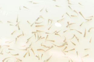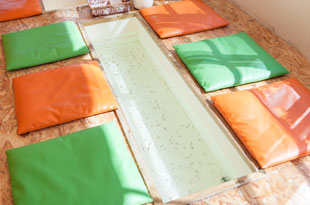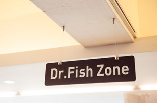 大人気!ドクターフィッシュ体験! さっそくタネ明かしです。さきほどのセットメニューには、こちらのドクターフィッシュ体験が含まれていたのです。セットメニューのほかにも、カフェメニューをオーダーした方はプラス3,000ウォンでドクターフィッシュ体験をすることができます。希望の方は、5階のフロアに設けられた「Dr.Fish Zone」に移動し、スタッフあるいは案内板の指示に従って足の洗浄から行います。あとは、足をドクターフィッシュのいるプールにつけるだけ!古くなった角質などをパクパクとついばんでくれる様子を楽しみましょう。