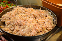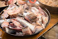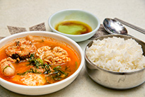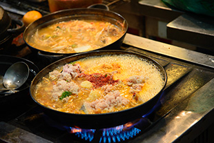 その場ですぐに煮込まれるメウンタン 食堂の前を通ると、店先に置かれた鍋には新鮮な海の幸がたっぷり。この様子をみるとそのまま通り過ぎるわけにはいかなくなります。新鮮な材料がぐつぐつと煮込まれたメウンタンの味が思い起こされ、いつの間にか足は食堂のほうへ。注文すると、鍋には強い火がかけられ、あらかじめ仕込まれたスープを入れ、店の軒先にある新鮮な魚が入れられます。そして唐辛子と様々な食材を使った薬味を加え、その場で煮込まれるメウンタンは見ただけで食欲がそそられます。