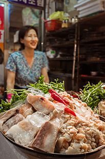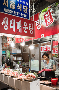 少々年齢層が高く感じられる広蔵市場(クァンジャンシジャン)に最近、若いカップルたちがよく訪れるといいます。 そのわけは何といっても、美味しいものがたくさん揃い、ソウルの食べ歩きコースとしてぴったりの場所だから。広蔵市場に多くの人が集まるのは食べ物の種類も豊富で、値段も安く人情が厚いからこそ。今回は多くの名店のなかでも、市場の西側に位置するメウンタン(魚の辛い鍋)専門店、ソウル食堂を紹介します。
