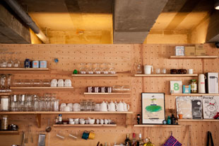 「Ym」独自の世界観がインテリアにも 店内に入って真っ先に目につくのは大きなオープンキッチンとそのインテリア。どこかのショールームに遊びにきたかと錯覚するほどにセンスよくディスプレイされたグラスやカップ。深いグリーンのソファーは日頃の疲れを癒してくれそう。お店全体は心地よいコーヒーの香りに包まれ、ついつい時間を忘れてしまいそうな穏やかな時間が流れています。夜は10時まで営業していてアルコールメニューも揃っているため、ゆっくりとお酒を楽しみたい方にも最適です。